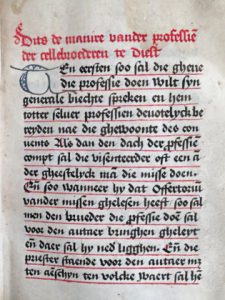 (Religion) - "Dits de manire vander professie[n] der cellebroederen te Diest". [Diest, begin 17de eeuw]. In-4° (19,5 x 15 cm) : [14] bln. Eigentijdse band : soepel perkament (licht verkleurd). Mooi verzorgd handschrift in zwarte inkt met initialen...