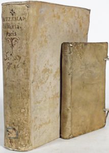 slightly browned copy, one marginal tear, one marginal ink stain). Contemporary binding : limp vellum, flat spine, ties (little soiled, binding quite loose, 2 ties lacking). First edition of this historical essay on the religious expeditions and wars of the Dukes of Brabant by the local ecclesiastical writer Johannes Molanus or Vermeulen (Lille 1553- 1585 Louvain), author of the famous "Annales urbis Lovianensis". Illustrated with a beautiful engraved allegorical title featuring the Brabant lion fighting with Moorish soldiers, enclosed by 2 knights and by an upper border depicting a battle. # Adams M-1 559; # STC Dutch 1 35; # Machiels M-538; # Matagne M-101; # BT 2146; # Biogr. univ. XV-48/55; # not in BB. ▲ Provenance : Rislyz (?) with the motto "Vivit post funera virtus" (handwritten annotation). Joint : AITZEMA, L.- Historia pacis, à foederatis Belgis ab anno MDCXXI. ad hoc usque tempus tractatae. Leiden, Elzevier, 1654, in-4° plein vélin (rel. lég. défraîchie). Édition originale de la traduction de cette histoire des guerres des Pays-Bas de 1 621 à la paix de Westphalie en 1648. # Willems 739; # NNBW IV-17/20; # Biogr. univ. I-282. ^ Édition originale, ornée d'un titre gravé, de ce récit des expéditions et des guerres religieuses entreprises par les ducs de Brabant ornée d'un titre gravé. Plein vélin souple de l'ép. (manquent 2 pl. dépl., lég. jauni, déch. et tache d'encre marginales, part. dérelié). Avec un ouvrage de Aitzema sur les guerres des Pays-Bas joint.