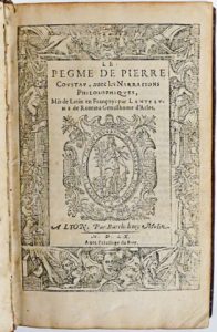 (Emblemata) - Coustau, Pierre.- Le Pegme, avec les narrations philosophiques, mis de latin en françoys par Lanteaume de Romieu gentilhome d'Arles. Lyon, par Barthelemy Molin (imprimé par Mace Bonhome), 1555. In-8° : 416-[7] pp. (ex. très lég....