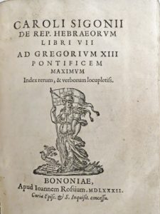 (Judaïca) - Sigonio, Carlo.- De Rep. Hebraeorum libri Vii [...]. Bononiae [Bologne], apud Joannem Rossium, 1582. In-8° : [12]-323-[15] pp. (marginal wormholes, rare and light damages otherwise in fresh condition). Contemporary binding : vellum with...