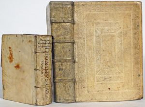 browned, several handwritten provenances on title-page, some handwritten notes in pen). Contemporary binding : pigskin, boards decorated with blind tooled roll-stamps (floral and portraits), ribbed spine (slightly rubbed, upper joint partly split). Very rare first edition of this biblical encyclopaedia and commentaries. With woodcut illustrations : 1 full-page portrait of Aaron, 1 diagram in texto and printer's marks on the title-page and on the last page, several ornamental initials. Scholar and exegete Sixtus of Siena (1520-1569) was first a Franciscan monk but accused of heresy he became a Dominican. # Adams S-1268; # USTC 856558; # not in Soltész (ed. 1575) nor in Machiels (ed. 1593). ▲ Provenance : Bartholomeus Scholl, Freising, 1581 (handwritten mention and ex- libris); Monastery Virginis Mariae, Gars, 1769 (handwritten mention and printed label). Joint : DIONYSIUS, Carthusianus.- In Sancta quatuor D.N. Jesu Christi Evangelia praeclarae admodum enarrationes [...]. Venetiis, ex officina B. Rubini, 1569, in-8° contemporary limp vellum (soiled, some pages slightly browned, lower margin of title- page lacking, ties lacking). Woodcut vignette on title-page; # Adams D-588, # Soltész D- 224, # not in Machiels. ^ Rare édition originale de cette encyclopédie biblique par l'exégète dominicain Sixte de Sienne illustrée de 2 in texto (portrait d'Aaron et un diagramme). Pleine peau de truie de l'ép. ornée à froid (pet. défauts, rel. us.). Commentaire biblique par Denys le Chartreux joint.
