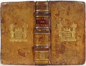 (underlinings, foxing, dampstains in the second half, large on some lvs). 18th Century emblazoned binding : sprinkled sheepskin, boards with gilt coat of arms in the center, ribbed spine with gilt coat of arms in the last rectangular design, sprinkled edges (slightly rubbed on some edges, upper joint split on 5 mm, corners very dulled). First edition of this important sacred iconological work of the theologian and catholic rector of Leuven University Molanus born Jan Vermeulen or van der Meulen (Lille 1533- 1585 Leuven). Treatise on sacred images expliciting the decrees of the Council of Trent, written more particularly against the iconoclasts who destroyed from 1566 furniture and decorations of churches in our provinces. Molanus gives detailed instructions and canons for artists to figure sacred scenes (Nativity, Dormition of the Virgin, Crucifixion, Holy Family), he questions the representation of Saint Christophe and Saint George, suggests to avoid nudity in depictions even for the child Jesus, etc. Printer's mark on the title-page, some ornemental initial letters. Work often reprinted. # Adams M-553; # Machiels M-535; # Biogr. nat. XV-48/55; # BT 2144; # not in BB nor in Soltész. ▲ Provenance : Jean-Baptiste-Théodore de Jonghe (1801-1860), one of the biggest book collector of Belgium (supra libros and ex-libris). ^ Édition originale de ce traité capital sur les images sacrées par Molanus, recteur catholique de l'université de Louvain. Pleine basane jaspée armoriée du 1 8e s. (mouill. dans la 2e moitié du vol., certaines larges).