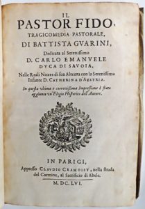 Ens. 2 ouvr. en 1 vol. in-4° - Guarini, Battista.- Il pastor fido, tragicomedia pastorale [...]. Parigi, Claudio Cramoisy, 1656. In-4° : [20]-287 pag. (macchie d'acqua nelle margine, lievemente brunito, provenienza ms. all'occhiello, arrossature)....