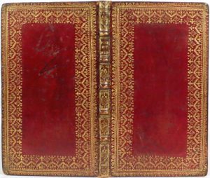 roulette dorée, dos à nerfs et caissons finement fleuronnés dorés, filet et roul. dorés sur les coupes et remplis, gardes de Brokatpapier (or sur fond ivoire), tranches dorées (coiffes et plat inf. lég. frottés, coin inf. sup. émoussé). Édition originale (il y a deux éditions parues chez le même éditeur à la même date, l'une en 78 pp. et celle-ci). # Tchemerzine IX-345 (ne se prononce pas sur l'antériorité de l'une sur l'autre). • Jolie reliure avec beau papier de gardes. Joint, même auteur : Oeuvres. Nouv. édition plus correcte & plus ample que toutes les précédentes. Paris, Compagnie des Libraires, 1767, 3 vol. in-12° plein veau moucheté de l'ép., dos à nerfs soulignés de filets dorés, tr. rouges (pet. mouill. à qqs ff. du t. II). Ill. d'un portrait de l'auteur par Cathelin et de 12 h.-t. par et d'après Jacques de Sève.