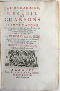 (Franc-maçonnerie) - Ens. 2 ouvr. en 1 vol. in-12° - Vignoles, Charles-Emmanuel de; Du Bois, J.P.G.- La Lire maçonne, ou Recueil de chansons des Francs-Maçons [...]. La Haye, R. van Laak, 1787. In-12° : [24]-xvi-536 pp. (pet. rouss. concentrées...