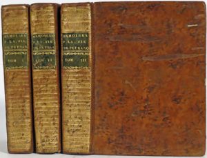 1764 [- 1767]. 3 vol. in-4° (texte n.c., rousseurs, rares taches, mouill. et déch. marg., qqs pp. lég. brunies, note ms. sur le titre du vol. I). Rel. de l'époque : pleine basane marbrée, dos lisses fleuronnés dorés "à la grotesque", tr. marbrées (éraflures, pet. us., pet. galeries ou trous de vers, qqs coins émoussés, note ms. de classification à la garde sup. du vol. I). Édition originale de cette biographie du célèbre poète italien (1304-1374) donnée par Jacques de Sade (1705-1778), oncle de Donatien, évêque de Narbonne et archevêque de Toulouse. Illustrée de 3 bandeaux historiés et de 3 vignettes de titre identiques. # Barbier III-234/235; # Brunet III-1605.