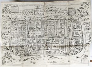 : [12 dont titre gravé]-286-[29] pp.; 12 h.-t. Rel. de l'époque : plein vélin sur ais de bois, plats cernés d'un filet et médaillon central à froid, dos à nerfs avec étiq. de cuir rouge, tr. rouges, fermoirs de laiton (pet. déchirure en bas du dos sans perte, provenance ms. sur la garde). Cinquième édition (éd. orig. : 1590) de cette importante description géographique et historique de la Terre Sainte par le théologien hollandais Christiaan Van Adrichem (Delft 1 533-1 585 Keulen). Accompagnée d'une chronique depuis la création du Monde jusqu'à la mort de Saint Jean l'Évangéliste. Comporte, outre le titre gravé, 1 1 cartes et 1 plan de Jérusalem sur doubles pages ou dépliants. # Biogr. univ. I-193/196; # BB I-28; # NNBW III-5/7; # Poortman & Augusteijn 37/39. Relié avec : (1). DANCKERTS, Cornelis.- 4 cartes et 1 plan de Jérusalem, copiés d'après Claes Janszoon et parus dans des éd. de "Statenbijbels" à partir de 1646; # Poortman & Augusteijn 157/166.— (2). AGUSTIN, Antonio.- Regum et imperatorum Romanorum numismata. Antv., apud Henricum Aertssens, 1654, [28]-103-[27] pp.; 68 pl.— (3). [Idem].- Antiquitatum romanarum hispanarumque in nummis veterum Dialogi XI. Id., id., 1653, [16]-202-[17] pp. Antonio Agustin (1516-1586) était un érudit et jurisconsulte espagnol, archevêque de Tarragone.