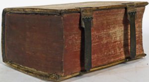 cm); 2 frontispieces (text n.c., foxing, wormholes in the engr. title and at the end of the copy, hanwritten provenance on the title-page). Contemporary binding : pigskin on wooden boards, blind stamped boards with fillets, floral roll-stamps and fleurons, ribbed spine with ink title, red edges, brass clasps (slightly soiled, handwritten note on the upper pastedown, stamp on the upper flyleaf). Translation of the Bible by the Catholic convert Kaspar Ulenberg (1549-117) illustrated with 2 frontispieces and several monogrammed woodcuts in the text. The ones with the monogram E.P. are sometimes accompanied with an engraving tool instead of the mention "Sculps.". The first edition was published in 1630 in Cologne and was often reprinted. # Darlow & Moule 4217 (1st ed.); # not in Renier. Joint : COCHEM, Martin von.- Das Grosse Leben Christi [...]. Maynz und Francfurt, Johann Mayers, 1737, in-8° sheespkin with brass clasps (dampstains in the beginning, some traces of use). Frontispiece, 2 folding plates and woodcuts in the text. ^ Bible allemande traduite par Kaspar Ulenberg illustrée de 2 front. et d'in texto. Pleine peau de truie de l'ép. (texte n.c., rouss.). Avec un ouvr. biographique sur Jésus joint.