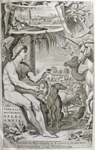 n.c., pet. rouss.). Rel. d'époque : plein vélin, plats avec médaillon central serti de filets à froid, dos à nerfs (rel. faiblement défraîchie, plats lég. bâillants, 2 coins abîmés avec manques partiels, 2 perforations à 1 plat). Oeuvres complètes d'histoire et philologie de l'érudit Bochart (1599-1667) : "Geographia Sacra, seu Phaleg et Canaan" (éd. orig. : 1646), traitant des peuples mentionnés dans la Genèse et des Phéniciens et "Hierozoicon, sive Bipartitum opus de animalibus S. Scripturae" (éd. orig. : 1663), consacré aux animaux de la bible, illustré du portrait de l'auteur, d'1 titre gravé et de 13 cartes (Syrie, Égypte, Mésopotamie...). Texte en latin, grec, hébreu, syriaque, samaritain et éthiopien. # Brunet I-1022; # Biogr. univ. IV-494/495.