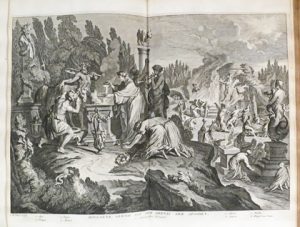 J. Wetstein, W. Smith, Samuel Luchtmans], 1725 [- 1731]. 4 vol. inf : [30 incl. frontispice]-92-143-[1 bl.]-321 [i.e. 323]-40-19, [4]-604 [i.e. 598]-[6]-230, [20]-1/392, [2]-393/924-[24] pp.; 170 pl. (mispagineringen, vlekjes passim, meerdere bladen gebruind, herkomststempels, hs herkomst op schutbladen van vol. I, enkele papierplooien in vol. 3 en 4). Eigentijdse banden : perkament, platten met blindgestempelde filetenkaders, hoekornamenten en centraal medaillon, rug met ribben en titels in pen (vervuild en enkele vlekken, platten licht gebogen). Eerste uitgave van de vertaling (1ste Fr. uitg. : 1722-1728) door Mattheus Gargon (1661-1728), predikant en rector te Vlissingen. Samen met de twee zeldzame supplementen vertaald door Jakob van Ostade en Arnold H. Westerhovius, beiden predikant te Gouda. Geïllustreerd met 1 frontispice, 2 opdrachtplaten en 168 platen (waarvan 67 op dubbele of uitvouwbare pagina) door o.a. Frans van Bleyswyck en Philip van Gunst : kaarten, plattegronden, zichten van bijbelse plaatsen en monumenten, ceremonies, portretten, munten enz. De schriftgeleerde en hoogleraar Calmet (1672- 1757) vulde zijn Bijbels woordenboek aan met een Bijbelbibliografie, een tijdrekentafel, een Joodse almanak, de wisselkoers van Hebreeuwsche en Joodse munten, een vergelijking van Joodse maten met de Franse en een lijst van letterlijk vertaalde Hebreeuwsche, Syrische en Griekse woorden. # Biogr. univ. VI-421/423; # NNBW IV-631/633. ^ Édition originale de la traduction de ce dictionnaire biblique complet de ses 2 rares suppléments. Illustrée d'1 frontispice, 2 planches de dédicace et 168 cuivres. Plein vélin de l'ép. (pet. défauts, rel. faiblement défraîchie).