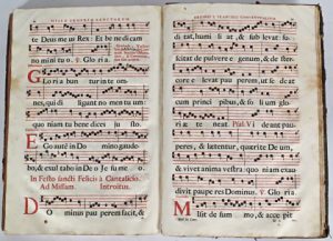 Balleoniana, 1743. Gr. inf : [6]-204-48 pp. (ex. défraîchi, mouillures, dans qqs cas avec moisissures, qqs pet. galeries de vers marg.). Rel. de l'époque : pleine basane, dos à nerfs, tr. rouges (rel. usée, trous et galeries de vers, manques, épidermures...). Antiphonaire, avec partitions à 5 portées imprimées en rouge et noir, contenant les hymnes en l'honneur des saints franciscains chantés lors des offices et des messes. Mariottini (1756-1827), chanoine de la cathédrale de Città del Castello, fut le professeur d'italien du comte Louis-Charles d'Orléans et ouvrit une école d'italien à Londres en 1792. Titre en rouge et noir avec vignette. Avec, en plus, le chant liturgique "Responsorium S. Antonii de Padua" (1 p.) dans les ff. lim. et 5 pp. mss (dont la garde inf.) de chants avec partitions.