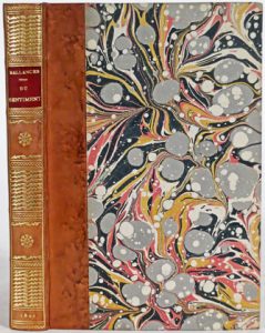 demi-veau marbré, plats de papier marbré, dos lisse doré "à la grotesque". Édition originale devenue rare de ce premier ouvrage de l'auteur, publié en partie par ses parents imprimeurs, distribué confidentiellement et dans lequel il se pose en continuateur de Rousseau en mettant en avant les sentiments, une certaine esthétique chrétienne et la poésie que les Lumières avaient mis de côté. L'ouvrage sera cependant éclipsé par la sortie du "Génie du christianisme" de son ami Chateaubriand. # pas dans Vicaire ni Escoffier. Joint, 4 ouvr. en jolies reliures : (1). BALLANCHE, P.-S.- Antigone. Paris, Didot l'aîné, 1814, in-8°, 226 [i.e. 326] pp., demi-veau vert de l'ép., dos fleuronné doré en long (frotté, qqs us.). Première édition complète, une édition partielle ayant été interrompue par des mouvements sociaux à Lyon l'année précédente (il n'en subsiste que quelques rarissimes ex.), dans laquelle Ballanche revisite le mythe d'Antigone et de son père Oedipe; # Vicaire I-169.— (2). [Idem].- Fragments. P., Ant.-Aug. Renouard, (impr. Didot l'aîné), 1819, in-32°, 80 pp., relié par Simier en maroq. vert Empire, monogramme doré A.V. sur le plat sup., dos lisse titré en long, filets dorés sur les coupes et remplis, tr. dorées, gardes de papier moiré blanc (coupes lég. frottées, qqs rouss.). Texte inspiré par un chagrin d'amour (éd. orig. : 1807).— (3). [BARANTE, Guillaume-Prosper Brugière baron de].- De la Littérature française pendant le dix-huitième siècle. P., Colin, 1809, in-8° plein veau blond moucheté de l'ép., plats cernés d'un filet à froid, dos lisse partiellement fleuronné "à la grotesque", tr. jaunes jaspées (décharges de cuir sur les gardes bl. sinon belle condition). Éd. orig. de cet ouvrage loué par Mme de Staël et Goethe dans lequel Barante défend l'idée que la littérature est liée à l'évolution des moeurs.— (4). AMPÈRE, J.J.- Ballanche. P., René, 1849, in-8° br. (qqs rouss., fragile couv. en bonne condition). 2de éd. parue qqs mois après l'originale (1 848). Ampère était considéré par Ballanche, qui meurt en juin 1 847, comme son fils spirituel.
