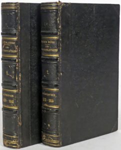 vol. in-16° (pâles pet. rouss. aux deux premiers ff. du t. Isinon très frais). Rel. de l'époque : demi-chagrin noir à coins, plats de percaline chagrinée noire, dos à nerfs et caissons ornés de filets à froid et dorés, tr. marbrées assorties aux gardes (pet. griffes sur les dos, mors part. frottés, lég. us.). "Édition originale". Les bibliographes se disputent sur l'antériorité d'une édition par rapport à une autre, les libraires favorisant souvent l'une ou l'autre version pour valoriser leur exemplaire. Pour Carteret et Vicaire, l'originale serait celle de Michel Lévy à Paris mais pour Talvart, ce serait la nôtre car composée la première et ayant servi à établir l'édition parisienne sur les bonnes feuilles de l'édition belge, Hugo ayant souhaité une édition simultanée selon de Sadeler. Intéressant témoignage du partage de l'édition "Hetzel" entre les deux libraires concessionnaires, Kiessling d'une part et Lebègue de l'autre. Exemplaire de premier tirage avec l'adresse de Lebègue rue Montagne de la Cour, la faute "bible" non corrigée (t. I, 57, l. 7) et la p. 100 erronément chiffrée 98 (t. II). # Talvart IX-34; # Carteret I-416/417; # Vicaire IV-320-321; # [Sadeler], Biblioth. Simonson, Sotheby's juin 2013, n° 165 (ex. en rel. d'ép. comme le nôtre); # Michaux, Bulletin du Bibliophile, 1929, p. 565 sq.