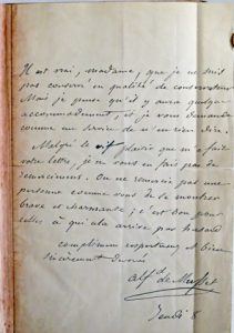 brune, plats de papier marbré, dos lisse fleuronné doré en long, monogramme doré en queue "A.S." (rel. défraîchie remboîtée, mors part. fendus, coins émoussés, coiffes restaurées, gardes renouvelées). Édition originale parue le 25 décembre 1832 et contenant diverses pièces en vers : le sonnet "Au lecteur", la longue "Dédicace" rimée à Alfred T[attet] qui livre le processus de sa création poétique, 2 poésies théâtrales ("La coupe et les lèvres" et "À quoi rêvent les jeunes filles"), un conte oriental ("Namouna"). Le volume constitue la "première livraison" de l'ouvrage, la seconde, en prose, paraîtra en 1834 en 2 vol. Enrichi de : - 1 lettre autographe signée de Musset à une correspondante non identifiée (Sand ?), 1 p. in-12°, "Jeudi 8", s.d. (pet. déchirure au pli, 1 pli restauré) : "Il est vrai, Madame, que je ne suis pas conservé en qualité de conservateur Mais je pense qu'il y aura quelque accommodement, et je vous demande comme un service de n'en rien dire. Malgré le VIF plaisir que m'a fait votre lettre, je ne vous en fais pas de remerciemens. On ne remercie pas une personne comme vous de se montrer brave et charmante; c'est bon pour celles à qui cela arrive par hasard. Complimens respectueux et bien sincèrement dévoués". # Carteret II-188; # Vicaire V-1239/1240. Joint : On ne badine pas avec l'amour, proverbe. Tirage à part du tome III, pp. 40-92, de la Revue des Deux Mondes. Paris-Londres, 1834, in-8° bradel plein papier blanc, couv. cons. (étiq. de la Librairie Tulkens). Pré-originale. Elle sera imprimée en 1834 dans la "seconde livraison" de l'ouvr. ci-dessus, puis à part en 1861.
