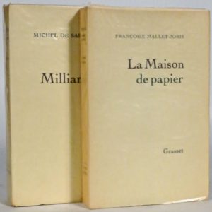 Ens. 2 ouvr. - Mallet-Joris, Françoise.- La Maison de papier. Paris, Bernard Grasset, (30 janvier 1970). In-8°. Broché (état de neuf, non coupé). Édition originale. Tirage à 64 ex. num. sur vélin pur fil dont 14 h.c., un des 50 mis dans le...