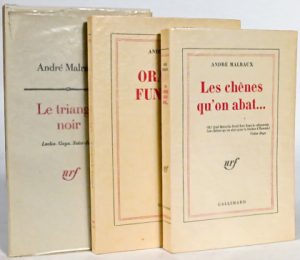 n° 89).— (2). Les Chênes qu'on abat... (1971). 1/310 (sur 390, n° 340). Dans cet ouvr., Malraux évoque le dernier entretien qu'il eut avec Charles De Gaulle.— (3). Oraisons funèbres. (1971). 1/310 (sur 390, n° 196). Recueil de 8 textes dont ceux de la Commémoration de la libération de Paris ou de la mort de Jeanne d'Arc, des funérailles de Le Corbusier ou de Braque, du transfert des cendres de Jean Moulin au Panthéon ou le discours "Pour sauver les monuments de Haute Égypte". Faites pour être lues à voix haute, ces oraisons suscitent l'émotion et font vibrer les âmes par leur appel à l'Histoire et, par delà, au Destin des hommes et des choses. Malraux écrivit d'ailleurs dans sa préface, p. 10 : "Les discours appellent le disque plus que le livre"; # Gérard, Marie.- L'oraison funèbre selon Malraux, ou comment concilier l'art et l'action, Revue d'Histoire Littéraire de la France 2002/6, Vol. 102, p. 1001-1012; # http://beaucoudray.free.fr/malraux.htm.