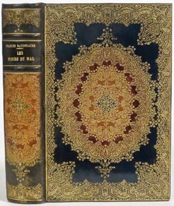 fleuronnés dorés avec listels et petites mosaïques diverses dans des styles inspirés par la Renaissance ou le Baroque, plats inf. estampés à froid de décors floraux, doublures de reps gris à cadres de veau fleuronné doré, gardes de même reps, t. dorées, sous étuis.— N° 3 : basane brune à décors mauresques, plats sur ais de bois avec reliefs et creux dorés avec éléments peints, doublures de soie moirée brune à cadres de veau fleuronné doré, garde de même soie, t. dorée (dos et fermoirs manquants).— N° 5 : basane brune, rel. d'inspiration médiévale sur ais de bois biseautés, dos à nerfs prolongés sur les plats en relief, fermoirs en métal, t. dorée, sous emboîtage.— N° 6 : bradel demi-toile beige et plats de papier avec bandes peintes (fermoirs manquants). (1). FLAUBERT, G.- Madame Bovary. Douze compositions par Albert Fourié. Paris, Quantin, 1885.— (2). BAUDELAIRE, Ch.- Les fleurs du mal, portrait de Baudelaire. P., Bibliophiles parisiens, 1921 .— (3). MUSSET, Alfr. de.- Les nuits, front. par O.D.V. Guillonnet, ornements de Léon Lebègue. Paris, Ferroud, 1912. Ex. num.— (4). BAUDELAIRE, Ch.- "Les fleurs du mal, petits poèmes en prose, les paradis artificiels". (London), The Casanova Society, 1925. En anglais; ex. num.— (5). [Idem].- Les fleurs du mal, illustr. de Rochegrosse. Paris, Ferroud, 1928. Portrait de l'auteur en front.— (6). La Guirlande des années. Images d'hier et pages d'aujourd'hui, 25 chefs d'oeuvre de la miniature. P., Flammarion, (1941).