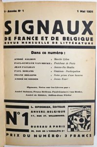 (Revue) - Signaux de France et de Belgique. Revue mensuelle de littérature. Anvers, L. Opdebeek, 1er mai [- octobre] 1921. In-8° (qqs rouss.). Rel. de l'époque d'amateur : bradel pleine toile noire, plat sup. titré "Signaux" sur carrés de toile...