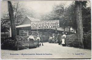 jointes, bonne condition générale). Dans un classeur moderne, sous pochettes individuelles en plastique. Impressionnante réunion de cartes postales relatives au Bois de la Cambre, et dont presque pas une n'est semblable à une autre. - Itinéraire : visite imagée du bois en commençant par l'entrée au bout de l'avenue Louise (+/- 15),- le bois avec la pelouse des Anglais, le trou du Diable, le pont rustique et la grotte ainsi que le grand ravin (+/-80),- les allées autour de l'étang, le champignon (4),- la cloche, la grande clairière (avec moutons paissant), le grand lac en diverses saisons (gelé en hiver), les promeneurs, cyclistes et cavaliers, les marchands de crème glacée, etc. Divers bâtiments qui attirèrent (et, pour certains, attirent encore) les Bruxellois : Chalet des Rossignols (construit en 1892 et actuelle discothèque), Chalet Gymnase (construit en 1875 et qui fut longtemps le Théâtre de Poche puis céda la place à l'actuelle patinoire), la Laiterie (construite en 1871 et détruite par les flammes en 1973 : 64 dont des vues d'intérieur), Chalet Robinson (construit en 1877 et détruit par les flammes en 1991 mais reconstruit dans le même style en 2008 : +/- 200 dont des vues avec ou sans le lac, avec le bac et/ou les barques, sur l'île, à l'intérieur du chalet, avec le pigeonnier construit en 1901...), Moeder Lambic qui a disparu (16) ainsi que le restaurant Trianon (25 avec vues de la terrasse, du dancing, de l'espace réservé à l'escrime ainsi que de l'intérieur), etc. - Divers : quelques cartes de la Drève de Lorraine (avec, déjà, la "Villa Lorraine", "Le Chalet de la Forêt", la "Villa Suisse"), 3 cartes de l'Exposition Universelle de Bruxelles qui se tint sur le site actuel Demot-ULB-Bois de la Cambre (avant et après l'incendie du 15 août 1910),- 5 c.p. de la visite de la Princesse Clémentine au bois dans un carrosse fleuri, 1 c.p. extraite du "De ci de là" de Lynen.