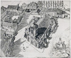 bords brunis). Album de 1 3 eaux-fortes en noir (dont celle de la couverture), signées, datées et titrées par l'artiste et tirées par Van Campenhout (les cuivres ont été barrés après tirage). Précédées d'une préface de Louis Lebeer, les vues révèlent un coin de Bruxelles disparu ou bien changé : "Le Homborg et le Kriekenput", "Le Papenkasteel", "Le Château du Wolvendael", "Le Vieux-Cornet en 1921", "La Ferme-Rose", etc. Tirage à 75 ex. sur Arches, un des 12 de luxe lettrés (ex. de chapelle ?) accompagnés : - du dessin original à la mine de crayon, 22 x 27,5 cm, signé et daté 1949 dans le bas à dr., avec qqs notes ou remarques dans les petites marges, préparatoire à la gravure "Parvis Saint-Pierre", - du 1er état de la même gravure, signé et justifié.