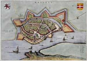 d'oiseau de Hasselt près de Zwolle figurant les remparts et les quais le long du "Swart Water". Premier état de ce plan faisant partie de l'atlas des villes des Pays- Bas septentrionaux de Blaeu paru de 1649 à 1652. # van der Krogt [1730].