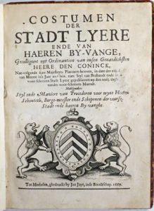 (Droit) - Costumen der stadt Lyere ende van haeren by-vange [...]. Tot Mechelen, Jan Jaye, 1669. In-4° : [8]-188-[3] pp. (titel verstevigd langs versozijde, sporadische vlekjes). Eigentijdse band : leder, rug met ribben en goudstempeling,...