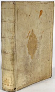 perkament, platten versierd met gouden filetenkader en centraal medaillon, gladde rug met goudgestempelde ribben (vervuild, lichte slijtage aan achterplathoeken). # Vanderhaeghen 612; # niet in Dekkers.