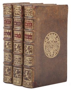 centre des plats, dos à nerfs orné de chiffres et pièces d’armes, tranches marbrées (reliure de l’époque). Nouvelle édition de ces mémoires parus pour la première fois de façon posthume en 1722. Il s’agit certainement de l’ouvrage le plus célèbre d’Amelot de La Houssaye ; un recueil de bons mots le plus souvent imaginés mais tout à fait plaisants et piquants. Barbier, dans son Dictionnaire des ouvrages anonymes, précise que le texte d’Amelot fut continué par Coquelet. Cette édition est vraisemblablement parisienne et parut indifféremment sous l’adresse de Zacharie Chatelain à Amsterdam et de Pierre de Hondt à La Haye. Elle est illustrée d’une vignette de titre gravée en taille-douce par Dupin d’après Bonnart. Exemplaire aux armes de Marguerite Delphine de Valbelle de Tourves, marquise de Rian. Coiffes des tomes 1 et 3 refaites, ainsi qu’une partie de la charnière du premier plat du second tome. Coins restaurés. Petite tache sur le premier plat du premier volume. Mouillures claires dans les second et troisième volumes. Provenance : Marguerite Delphine de Valbelle de Tourves, avec ses armes sur les plats. - Bibliothèque de Chissay, avec ex-libris armorié.