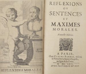 dorées sur marbrure (Cuzin). Tchémerzine, IV, 38. Seconde édition originale, d’une grande rareté selon Tchémerzine qui précise que l’Avis est nouveau, que le Discours préliminaire a été supprimé tout comme 15 Maximes. Le mot « Pieté » au lieu de « Pitié », page 98, n’est pas corrigé. L’édition est illustrée d’un frontispice gravé par Stéphane Picart, le même que l’on trouve dans l’originale de 1665. Bon exemplaire relié par Cuzin, malgré des frottements aux charnières et aux coins.