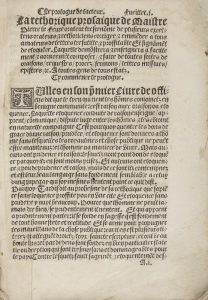 escrire.] Rouen : Thomas Rayer pour Symon Gruel, 1521. — 2 parties en un volume in-4, (5 ff. sur 6, manque le titre), ciij ff. mal chiffrés cij, (1 f.) ; xlix ff. mal chiffrés xlviii, (1 f.). Dérelié. Bechtel, p. 281. - Brunet, II, 1149-1150. Édition originale très rare, imprimée en caractères gothiques et comprenant 36 lignes par page. Ce traité est l’œuvre de Pierre Le Fèvre (1450?-1521 ou vers 1535), dit Pierre Fabri, curé de Meray, poète et rhéteur normand, originaire de Rouen. Il s’agit du premier livre français consacré à la « pleine rhétorique », c’est-à-dire associant la première rhétorique qui est celle de la prose et la seconde désignant l’art des vers. L’ambition de l’auteur était de proposer un traité complet de l’art d’écrire. L’ouvrage est divisé en deux parties. Alex L. Gordon, dans son ouvrage Ronsard et la rhétorique, en a donné précisément le contenu : « Le premier volume qui est consacré à la prose offre une définition de la rhétorique et de ses cinq parties : l’invention, la disposition, l’élocution, la mémoire et la prononciation. Fabri analyse ensuite les divisions du discours : l’exorde, la narration, la division, la confirmation, la confutation et la conclusion. Plus loin il prodigue des conseils particuliers concernant l’exorde en genre « judicial », la confirmation et la confutation en genre « délibératif ou concional », et concernant l’exorde, la confirmation et la confutation en genre « démonstratif ». L’ouvrage se termine par une longue analyse des couleurs de rhétorique et par des préceptes divers sur la composition des lettres. Dans le second volume, Fabri enseigne « l’art de rithmer ». Il définit le « rithme » et s’attaque aux petits problèmes de la métrique, comme la différence entre e masculin et e féminin. Ensuite, après avoir expliqué les différentes sortes de rimes et « tailles », il conclut son ouvrage par une liste de « vices de incongruité et de aulcunes figures ». Il s’agit en particulier des figures poétiques, comme l’anaphore, la syncope et l’allitération » (Alex L. Gordon, Ronsard et la rhétorique, Droz, 1970, pp. 15-16). Exemplaire dérelié, incomplet du premier feuillet comprenant le titre au recto et le privilège au verso. Quelques notes marginales de l’époque. Le dernier feuillet est couvert, après le texte imprimé, de 25 vers manuscrits de l’époque, certains ayant servi de devises à des personnages de Picardie, bourgeois et marchands entre autres, qui avaient notamment offert des tableaux et autres œuvres d’art à la Confrérie de Notre-Dame du Puy d’Amiens. Ces vers font également partie des refrains des chants royaux donnés en l’honneur de la Vierge au Puy d’Amiens. Réparation à plusieurs feuillets avec de très rares atteintes au texte. Déchirures au dernier feuillet, mouillures essentiellement en début et fin de volume, trou de ver aux 20 premiers feuillets, sans gravité.