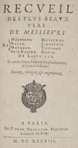 MALHERBE (François de) - RACAN - MAYNARD. Etc. Recueil des plus beaux vers de messieurs De Malherbe, Racan, Maynard, Bois-Robert, Monfuron, Lingendes, Touvant, Motin, De L’Estoile. Et autres divers Auteurs des plus fameux Esprits de la Cour....
