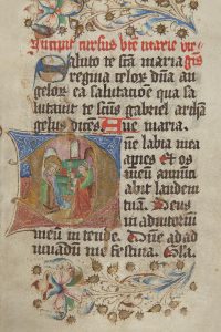 dorées (reliure du XVIIe siècle). Manuscrit en latin sur parchemin d’un feuillet blanc et de 272 feuillets non foliotés de 108 x 77 mm. Le texte, rubriqué en rouge et bleu, est écrit à l’encre brune sur une colonne de 14 lignes par page d’une justification de 70 x 52 mm pour les 199 premiers feuillets, et de 15 lignes par page d’une justification de 67 x 45 mm pour les derniers feuillets. Composition du texte : - f. 1 : blanc. - ff. 2 r° à 106 v°: Incipit cursus beatae Marie Virginis. - f. 107 : blanc. - ff. 108 r° à 119 r° : Psaumes de la Pénitence. - ff. 119 r° (3 dernières lignes) à 127 r° : litanies (dont Géréon, martyr de Cologne, saint Séverin, évêque de Cologne, sainte Cordula, morte à Cologne ou encore sainte Ursule, de Cologne) suivies d’oraisons. - f. 127 v° : blanc. - ff. 128 r°- 199 v° : Office ou « Vigiles » des morts, suivi de litanies et du « de Officio sepulture » (inachevé). - f. 200 : blanc. Les feuillets 201 à 268 proviennent d’un autre manuscrit de la même époque, d’une écriture différente. Le texte est de 15 lignes par page et comprend la liturgie de la Passion à l’Ascension du Christ et l’Assomption de la Vierge. Décoration : La première partie du manuscrit comprend 3 lettrines enluminées en or ainsi que quelques belles initiales : - f. 2 r° : bordures florales et lettrine historiée représentant l’Annonciation. - f. 40 r° et f. 67 v°: bordures et lettrines florales. - ff. 47 v°, 55 r°, 59 v°, 72 v°, 74 v°, 77 r°, 79 r°, 83 v°, 89 v° et 95 v° : lettrines filigranées. - f. 108 r° : bordures florales et lettrine historiée représentant le roi David en prière. - f. 126 : bordures florales et lettrine historiée représentant le Christ juge entre la Vierge et Saint Jean. La seconde partie comprend de nombreuses initiales « parties », rouges et bleues. Le manuscrit, essentiellement dans la seconde partie, comprend également de nombreuses pages de musique comportant des portées de quatre lignes en rouge. Même si les Heures et l’office des morts ne permettent pas d’établir de façon formelle l’usage de ce manuscrit, la présence de nombreux saints en rapport avec la ville de Cologne nous permet de penser qu’il était bel et bien destiné au diocèse de cette ville. Provenance : S. Maria Catharina Drieschen, avec ex-libris manuscrit au premier contreplat (XXe siècle). Défauts : Les bordures florales ont été légèrement rognées et sont effacées par endroits. Il manque plusieurs feuillets, notamment entre les feuillets 14-15, 127-128, 134-135, 180-181, 186-187, 192-193, 198-199, après le feuillet 199 et à la fin du manuscrit où il manque 4 feuillets. Ces lacunes n’engendrent pas toujours de coupures dans le texte, à l’exception de la fin de la partie Vigiles des morts (après le feuillet 199) et la fin du manuscrit, et correspondent sans doute pour certaines à des feuillets vierges ou à l’emplacement d’une enluminure. Manque dans la marge inférieure du feuillet 225, sans atteinte au texte. Coins émoussés, manque un élément au fermoir supérieur.