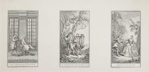 par Jan Punt (1711-1779) d’après Boucher, pour l’édition donnée à Amsterdam en 1741 des Œuvres complètes de Molière. Cette suite est imprimée sur 6 feuillets in-plano à toute marge, pliés, dont 5 contenant 6 gravures et 1 qui en comprend 4. On y retrouve le portrait de Molière et les figures pour L’Étourdi (1738), Le Dépit amoureux (1738), Les Précieuses ridicules (1738), Le Cocu imaginaire (1738), Dom Garcie de Navarre (1738), L’École des maris (1738), L’Impromptu de Versailles (1739), La Princesse d’Élide (1739), Les Plaisirs de l’Île enchantée (1739), Les Fâcheux (1739), L’École des femmes (1739), La Critique de l’École des femmes (1739), Le Misanthrope (1739), Le Médecin malgré lui (1739), Mélicerte (1739), Le Mariage forcé (1739), Le Festin de Pierre (1739), L’Amour médecin (1739), Amphitryon (1740), L’Avare (1740), George Dandin (1740), L’Amour peintre (1740), Tartuffe (1740), Prologue d’Amphitryon (1740), Monsieur de Pourceaugnac (1740), Les Amants magnifiques (1740), Le Bourgeois gentilhomme (1740), Les Fourberies de Scapin (1740), Prologue de Psyché (1740), Psyché (1740), Les Femmes savantes (1740), La Comtesse d’Escarbagnas (1740) et Le Malade imaginaire (1740). Très bel exemplaire relié par Canape et Corriez.