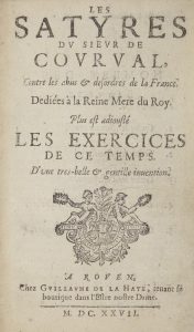 SONNET DE COURVAL (Thomas). Les Satyre du sieur de Courval, Contre les abus & desordres de la France. Plus est adiousté les exercices de ce temps. D’une tres-belle & gentille invention. Rouen : Guillaume de La Haye, 1627. [Suivi de] : Les...