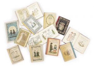 PARUS EN FRANÇAIS. Ces charmants petits ouvrages pour enfants sont ornés d’illustrations en couleurs de Kate Greenaway, dans le texte ou à pleine page. L’année 1887 est de format oblong. Ensemble parfaitement conservé hormis une trace de mouillure à la couverture de l’année 1884. Trois almanachs ont conservé leur jaquette imprimée d’origine.