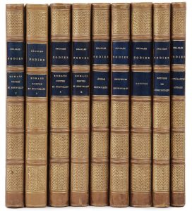 collective, en partie originale, des œuvres de Charles Nodier, que l’on trouve rarement complète. Comprend : Tome 1 : Jean Sbogar. Troisième édition, corrigée et augmentée (1832). — Tome 2 : Le Peintre de Saltzbourg. Adèle. Thérèse Aubert (1832). Complet des deux plats de couverture. Reliure moderne à l’imitation. — Tome 3 (manque). — Tome 4 : La Fée aux miettes (1832). Cahiers 1 et 2 brunis. — Tome 5 (manque). — Tome 6 : Mademoiselle de Marsan. Le Nouveau Faust et la nouvelle Marguerite. Le Songe d’or (1832). — Tome 7 : Le Dernier banquet des Girondins ; étude historique suivie de recherches sur l’éloquence révolutionnaire (1833). — Tome 8 : Souvenirs et portraits (1833). — Tomes 9 et 10 (manquent). — Tome 11 : Contes en prose et en vers (1837). — Tome 12 : Notions élémentaires de linguistique, ou histoire abrégée de la parole et de l’écriture, pour servir à l’alphabet, à la grammaire et au dictionnaire (1834). — Tome 13 (manque). Très bel ensemble, bien relié uniformément. On joint, dans une reliure identique : - Questions de littérature légale. Du Plagiat, de la supposition d’auteurs, des supercheries qui ont rapport aux livres. Seconde édition, revue, corrigée et considérablement augmentée. Paris : imprimerie de Crapelet, 1828. On joint également : - Mélanges tirés d’une petite bibliothèque, ou variétés littéraires et philosophiques. Paris : Crapelet, 1829. — In-8, demi-veau havane, dos à nerfs orné, tranches mouchetées (reliure de l’époque). Édition originale. Fente aux charnières.