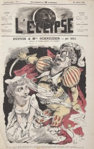 L’éclipse forme la continuation de La Lune, journal publié sous la même direction entre 1865 et 1868. Illustré essentiellement par André Gill, L’éclipse connut de nombreux déboires, la censure n’hésitant pas à mettre un frein à l’ingéniosité de l’illustrateur. Cette censure indisposait grandement Gill, à tel point qu’il se sentait menacé dans son talent et dans sa sécurité. Valmy-Baysse rappelle que du 4 octobre 1868 au 14 août 1870, l’administration n’interdira pas moins de vingt-deux numéros de L’éclipse (Valmy-Baysse, Le roman d’un caricaturiste, André Gill, éd. 1927, p. 129). Cette censure réagissait souvent au dernier moment, si bien qu’il fallait composer une nouvelle caricature dans la hâte. Les exemplaires recomposés portent en général le numéro du fascicule suivi de la lettre « b » pour bis. Les caricatures touchaient aussi bien des personnages de la vie politique que ceux de la vie artistique et littéraire. En 1876, deux ans après la mort de François Polo, la vente du journal s’essoufflant, il fut décidé d’en réduire le format. Gill n’y trouva pas son compte, rêvant de grandes compositions, et commença une nouvelle aventure avec La Lune rousse dont le premier numéro parut le 10 décembre 1876. Exemplaire composé comme suit : Volume 1 : n° 1 à 139. Comprend : n° 14 et 14 bis, 2 tirages du numéro 15 (Sainte-Beuve et Gustave Doré), n° 29 et 29 bis, n° 37 et 37 bis, n° 44 bis, n° 49 bis, n° 51 bis, n° 53 bis, n° 55 et 55 bis, n° 59 bis, n° 71 bis, n° 87 bis, n° 98 bis, n° 99 bis, n° 103 bis, n° 106 bis, n° 114 et 114 bis, n° 116 et 116 bis, n° 128 bis, n° 129 et 129 bis, 132 et 132 bis, n° 133 et 133 bis, n° 134 et 134 bis, 5 suppléments d’André Gill. Volume 2 : n° 140 à 212 et de 214 à 400. Comprend le supplément du n° 197. Exemplaire quasi complet, il ne manque que le numéro 213. Il totalise 410 fascicules dont la majorité des numéros bis ; il comprend également les cinq rares suppléments d’André Gill pour 1870 et le supplément du n° 197. Le numéro 125 est numéroté 126 ; il parut en premier le 11 juin 1870 numéroté 125 et reparu le 16 juin numéroté 126 comme ici. Le premier numéro 128 est en réalité le 127, il parut avec l’un ou l’autre numéro. Il manque, comme souvent, plusieurs numéros censurés : le tirage du n° 46 représentant Ténot, celui du n° 92 représentant le « Conseil des Rats », celui du n° 105 représentant « Troppmann », les numéros 44, 49, 51, 53, 59, 71, 87, 98, 99, 103 et 106. On trouve en revanche les numéros censurés 151 et 156 mais sans leur numéro bis. On trouve à la fin du tome 1, le premier numéro du journal Gulliver, du 20 février 1868 ainsi que le numéro 15 du 7 décembre 1867 de Diogène. Dos passés, frottements d’usage. Il manque le premier feuillet avec l’illustration du numéro 4. Le numéro 140, ouvrant le second volume, a été restauré. Déchirure sans manque au second feuillet des n° 18 et 89 et au premier feuillet des n° 90 et 116. Mouillures aux derniers numéros ayant légèrement endommagé certains fascicules.
