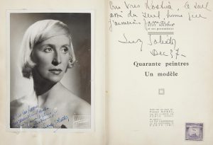 (Lucie Weil). Édition originale de cet ouvrage donnant la reproduction en noir et blanc de 35 portraits de Suzy Solidor, réalisés par les plus grands peintres de l’époque tels que Mariono Andreu, Yves Brayer, Paul Colin, Jean-Gabriel Domergue, Raoul Dufy, Foujita, Othon Friesz, De Geetere, Jacovleff, Kisling, Marie Laurencin, Mariette Lydis, Francis Picabia, Van Dongen, Vertès, etc. Ces 35 portraits de peintres sont précédés de 5 portraits d’écrivains, à savoir Suzy Solidor elle-même, Francis Carco, Maurice Magre, Joseph Kessel et A. T’Serstevens. Suzy Solidor (1900-1983), chanteuse, actrice et romancière, était l’une des figures emblématiques des années 1930 qui contribua à populariser le milieu homosexuel parisien. Elle fut l’égérie des photographes et des peintres de l’époque. Intéressant exemplaire, un des 100 premiers sur papier pâte-photo, ayant appartenu à l’un des plus proches amis de Suzy, Kostia Vlasto. Il comprend trois beaux envois de Suzy Solidor réalisés à des époques différentes : Le premier figure sur le titre : Pour vous Kostia, le seul ami du seul homme que j’aimerais jamais. Suzy Solidor. Déc. 37 Le second se trouve sur une photo originale de Suzy des studios Harcourt collée en regard du titre : Si tous les hommes vous ressemblaient Kostia il n’y aurait plus de lesbiennes !! Suzy Solidor Le troisième se situe à la fin du premier texte : Un moineau se promène comme une petite fille en capuchon et une petite fille, renversée sur le dos, rit en écartant les jambes et montrant sa coquille, la Merveille. Pour Kostia son amie Solidor Cette dédicace est datée d’une autre main de décembre 1952. L’exemplaire comprend également un portrait photographique en couleurs vraisemblablement de Kostia Vlasto, collé au recto du faux-titre, les signatures autographes de Paul Colin (x 3), Jean-Gabriel Domergue (x 2 dont l’une accompagnée d’une dédicace), Don, Raoul Dufy et Francis Picabia (x 2) sur les reproductions des peintures qu’ils ont réalisées, ainsi qu’une lettre autographe signée « Jean », datée du 26 février 1953, adressée à Kostia et écrite aux crayons de couleurs. L’auteur de la lettre prévient qu’il n’a pas pu avoir les signatures de Kisling, Carco et Foujita. Dos passé et frotté.