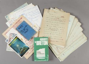 et 2. Le manuscrit est accompagné d’un dossier titré «Personnages et Moeurs», composé de notes manuscrites d’Auguste le Breton, sur les personnages du roman, et leurs habitudes. Il est joint diverses cartes, guides, cartes postales, publicités, photographies et documents sur la Colombie et ses mines, un petit carnet à spirales, titré sur la couverture «Rififi : Bogota. Notes» rempli «d’informations locales» manuscrites de l’auteur, ainsi qu’un exemplaire imprimé, au titre définitif de «Rouges étaient les émeraudes», édité chez Plon, en 1971.