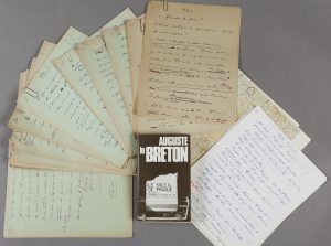Vésinet. Juin à septembre 1967» suivi de son typique mot de fin : «Faim». On trouve en début de manuscrit, une liste des noms des personnages, le manuscrit de la dédicace et celui de présentation de ses oeuvres précédemment parues. Il est joint un dossier comportant 5 pages tapuscrites sur les noms et diminutifs locaux, sur la monnaie et sur les salaires locaux, ainsi que quelques fiches signalétiques des personnages et 18 pages de notes manuscrites, diverses, sur le pays. L’ensemble est accompagné d’une grande carte en couleurs, de cartes postales, de dépliants touristiques et de cartes.Il est joint un exemplaire imprimé de l’édition de Plon de 1968.