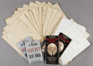 annoté «taper en 5 exemplaires», et se termine par la mention «New-York. Le Vésinet. Novembre 1961 - février 1962». A ce manuscrit, est joint quelques feuillets manuscrits de notes et de reprises du chapitre 17.Il est joint un important dossier contenant divers dépliants, guides et cartes de New-York, publicités, cartes postales, coupures de journaux, des photographies, des fiches signalétiques des personnages, et environ une cinquantaine de feuillets de notes manuscrites sur la ville, et ses différents lieux touristiques avec plans manuscrits. On y trouve également une note manuscrite de 4 pages sur un crime et une amusante offre de récompense pour la perte du manuscrit de son roman.Il est joint également un exemplaire de l’ouvrage imprimé, en deux volumes, édité aux Presses de la Cité, en 1962.