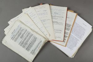 mécontent du travail proposé, Auguste le Breton adresse une lettre aux réalisateurs du film, dont nous possédons l’originale manuscrite et la copie de l’exemplaire tapée à la machine, envoyée, dans laquelle il reproche différentes orientations prises par les adaptateurs. Il joint une note et une critique de 11 pages sur leurs travaux, dont nous possédons également l’originale manuscrite et la copie tapée à la machine, ainsi que des notes manuscrites pour la rédaction de sa lettre. On trouve encore un tapuscrit corrigé à l’encre des différentes idées qu’il aurait aimées voir apparaître dans l’adaptation.A ces documents sont joints la construction du film avec toutes ses différentes étapes, tapée à la machine, largement corrigée à l’encre bleue et rouge, et formée de 44 feuillets sous couverture, ainsi que la continuité non dialoguée du film, contenant 31 feuillets de copie carbone.A cet important ensemble, est également joint le scénario de base du film, intitulé «Hold-up atomique». Le scénario est ici dans sa version manuscrite et dans sa version tapuscrite. Il comporte pour l’un une soixantaine de pages et pour l’autre 55 feuillets, accompagné de différentes notes manuscrites.