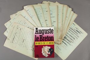 par un épilogue. Le manuscrit est rédigé sur des feuilles vertes, comme à son habitude.Le manuscrit est placé dans une chemise portant le titre «Le Rebecca chez les Biens-Nés» qu’Auguste Le Breton transformera en «Du Rebecca chez les Aris-tos».Il est joint un exemplaire imprimé de l’ouvrage, édité aux Editions du Rocher en 1991.