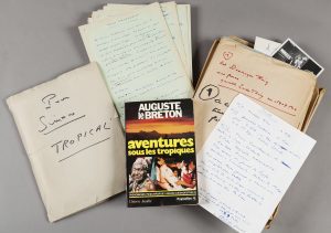 numérotation disparate.L’ensemble se présente sous une chemise titrée à la main «Tropical» qu’Auguste Le Breton transformera en «Aventures sous les Tropiques».Il est joint diverses notes, documents et photographies ayant servi à l’écriture du livre. Cet ensemble se présente sous la forme de 8 dossiers titrés correspondant chacun à une partie du livre. Chaque dossier contient notamment des notes manuscrites et tapuscrites.On trouve encore 13 feuillets de notes manuscrites sur les Caraïbes, la Martinique et ses grandes villes, le bateau et les vents. De plus, on trouve 8 feuillets numérotés comme dans le manuscrit et diverses notes.Il est joint un exemplaire imprimé du livre édité chez Pygmalion en 1977.