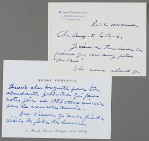 Henri VERNEUIL de son vrai nom Achod Malakian (1920-2002) réalisateur et scénariste. Deux cartes autographes signées de félicitations, à son en-tête.