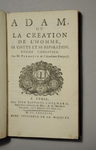 PERRAULT, Charles. Adam ou la création de l’homme, sa chute et sa réparation. Poème chrestien. Par M. Perrault de l’Académie Françoise. Paris, J.B. Coignard, 1697. In-12, (5 ff), 93 pages, (1 page) pour le Privilège. Veau du temps. (Coiffes...