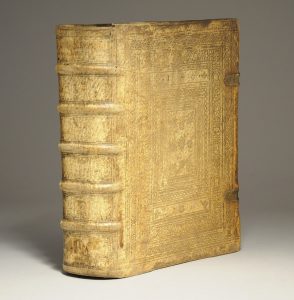 frises végétales alternant avec des filets droits. Coupes biseautées. Initiales I G frappées à froid sur le premier plat. Traces d'attaches. Reliure d'Allemagne du Sud du temps. Ex-libris manuscrit : Ioannis Geis [1 G]parochi Kirchahausensis. (Fortes rousseurs, et quelques défauts de papier. Quelques traces d'usure à la reliure).