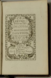 SENAULT, Elisabeth. Heures nouvelles dédiées à Monseigneur Dauphin, écrites et gravées par Elisabeth Senault. A Paris, chez de Hansy, libraire, sur le Pont au Change, à Saint Nicolas. (SD : vers 1690) In-12, (2 feuillets), 212 pages. Veau...