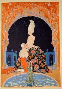américaine signée Brentano's, datée 1937. Couvertures illustrées et dos conservés. (Coins et coiffes légèrement frottés. Tache sur le premier plat). Titre et 20 figures hors-texte en couleurs et argent de George Barbier, exécutées au pochoir. Etiquette C. Joyaux, libraire à Tours. Un des CLXXV (n°L) exemplaires sur vélin "réservés à l'Amérique”. Un des beaux ouvrages art-déco de Barbier. (Carteret, IV, 393. Monod, 11092).