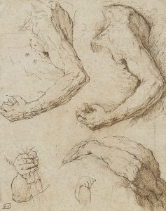 Étude ITALIENNE de la fin du XVIe siècle Étude de deux mains et trois bras Plume et encre brune. Porte en bas à gauche le cachet de la collection E. Calando (Lugt n°837). 15.7 x 12.3 cm